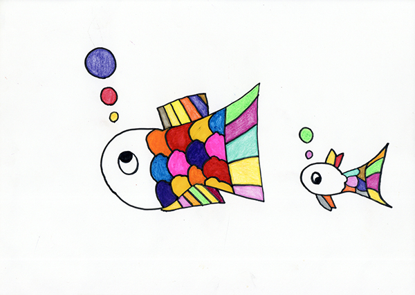 ▲2023年7月号 山田 恵子「あわを、ふいている魚達」2013年 268×377mm 水性ペン、色鉛筆、紙