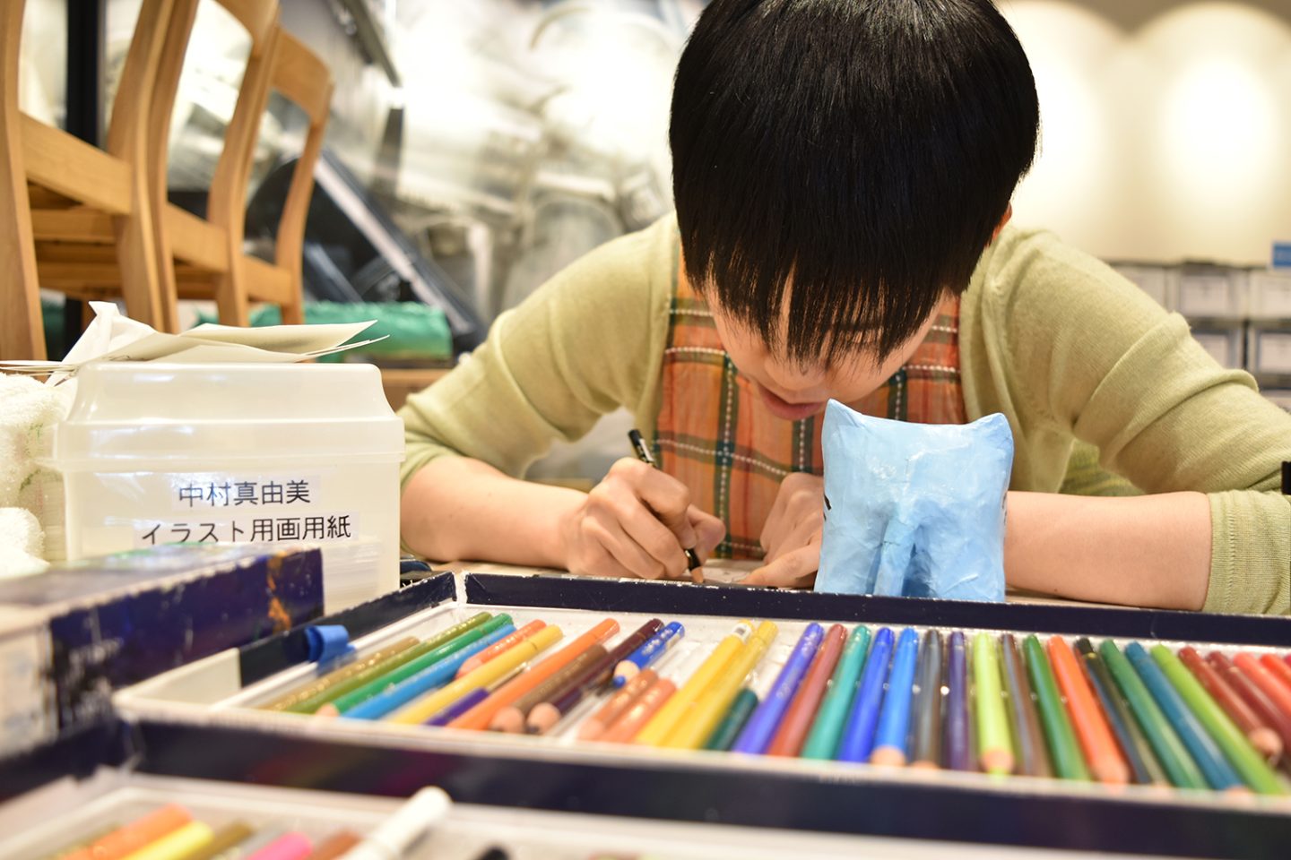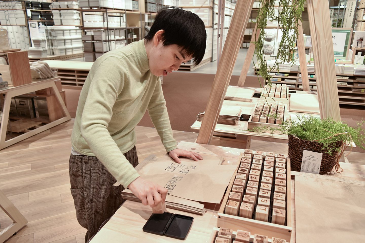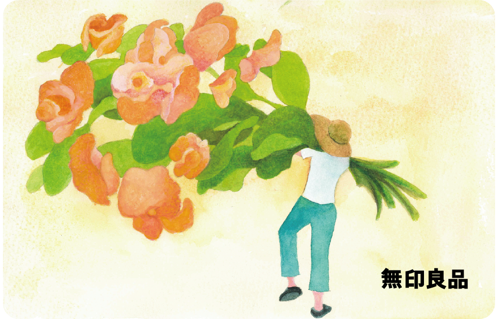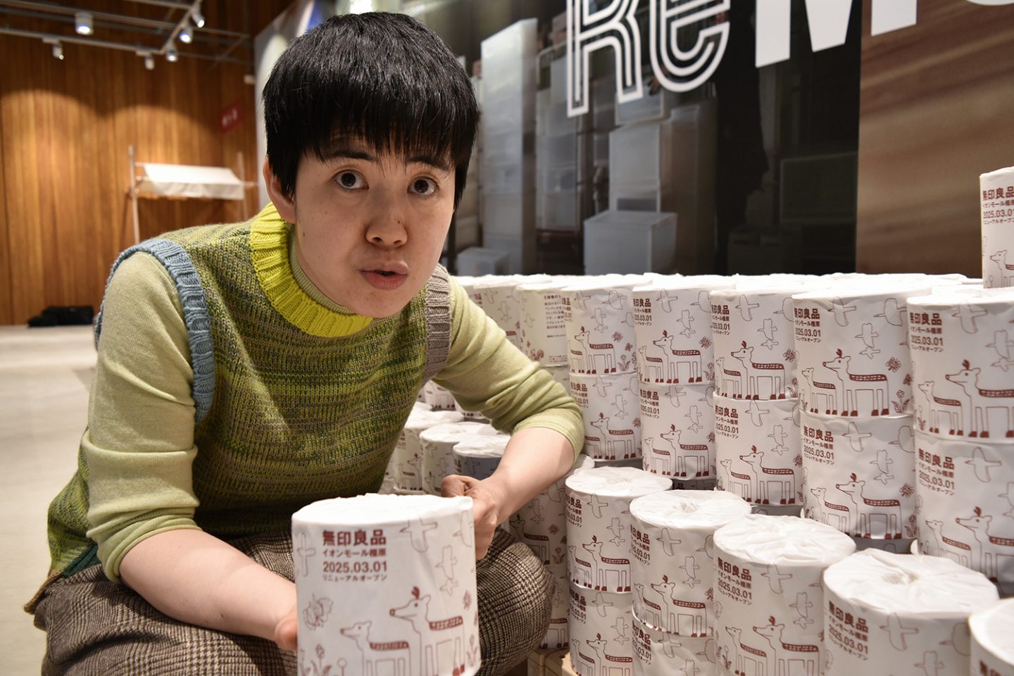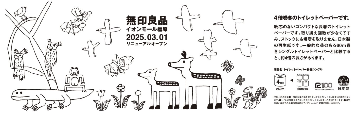 2025年3月1日(土)にグランドオープンした「無印良品 イオンモール橿原」店の壁面デザイン、ギフトカード、記念ノベルティ(トイレットペーパー)に、登録アーティストの中村真由美さん、Momocaさん、山田恵子さん、太田宏介さんの作品が採用されました。 店内中央に位置する子どもたちの遊び場「OpenMUJI」の壁面には、中村さんの描き下ろしイラストがリズム良く散りばめられています。中村さんが普段からモチーフにしている動物や食べ物に加え、奈良にゆかりのある鹿や仏像、はにわ、古墳、八咫烏などが描かれています。子どもたちが自由に手に取れる絵本や木で作られた楽器で楽しく遊べるだけでなく、すぐそばには大人も座ってコーヒーを飲んだり本を読んでリラックスできるワークスペースもあり、誰もが思い思いに過ごせる空間になっています。 店内奥にある「スタンプコーナー」では、中村さんのイラストのスタンプを、無印良品の紙製品に自由に押して、自分だけのオリジナルデザインのノートやメモ帳を作ることができます。同店のグランドオープンに合わせ、中村さんのイラストを使用したシルクスクリーン体験ワークショップも開催され、中村さんもお客様やスタッフの皆さんと交流されていました。 MUJIギフトカードには、Momocaさんの作品が採用されました。大きな花束を持つ麦わら帽子の女性が描かれた素敵なデザインのカードで、贈り物にピッタリです。こちらは全国の無印良品で2025年3月1日から販売されています。(数量限定、在庫なくなり次第終了) また、オープン記念として、中村真由美さん、太田宏介さん、山田恵子さん3名のイラストがラッピングされたオリジナルトイレットペーパーも数量限定で配布されました。