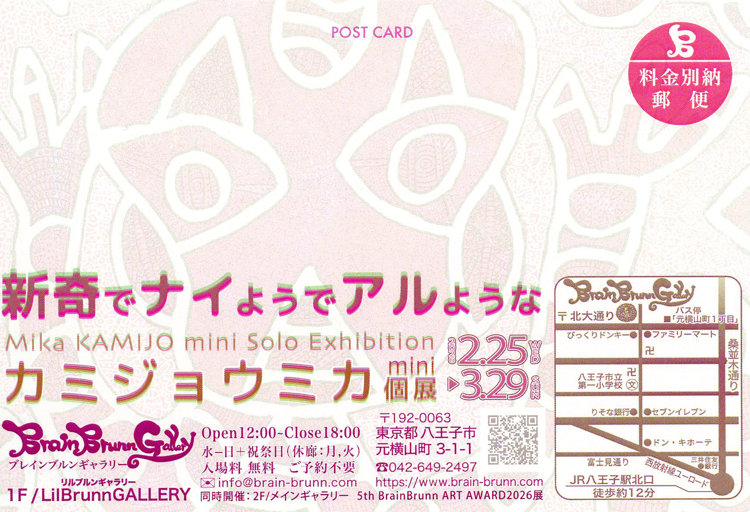 東京都八王子市にある現代美術専門のギャラリーBrainBrunnGALLERY(ブレインブルンギャラリー)で、カミジョウミカさんのmini個展が開催中です。画歴30年を経た近年のモチーフの変化と、新たな「新奇」の探求を提示される展示内容となってます。ぜひ足をお運びください!