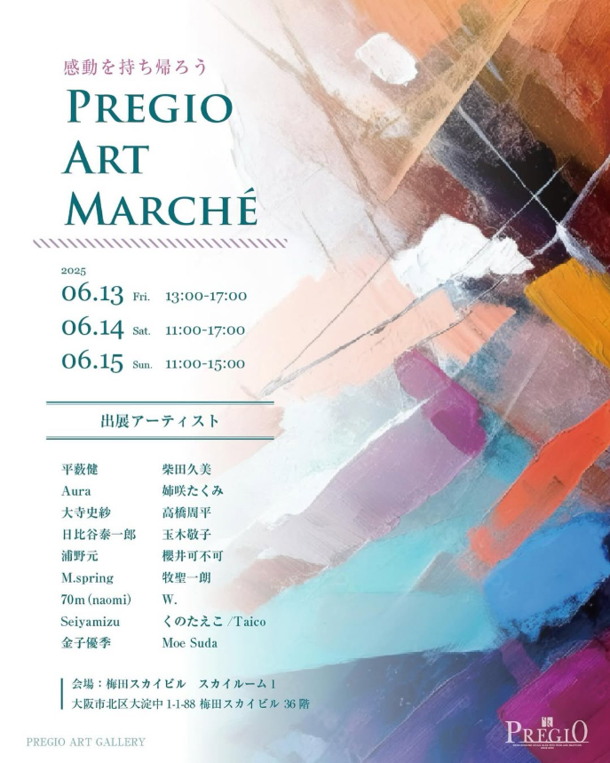 展覧会名:『PREGIO ART MARCHE(プレジオアートマルシェ)』 会期:2025年6月13日(金)〜6月15日(日) 主催:株式会社プレジオ 会場:梅田スカイビル スカイルーム1(36階)
